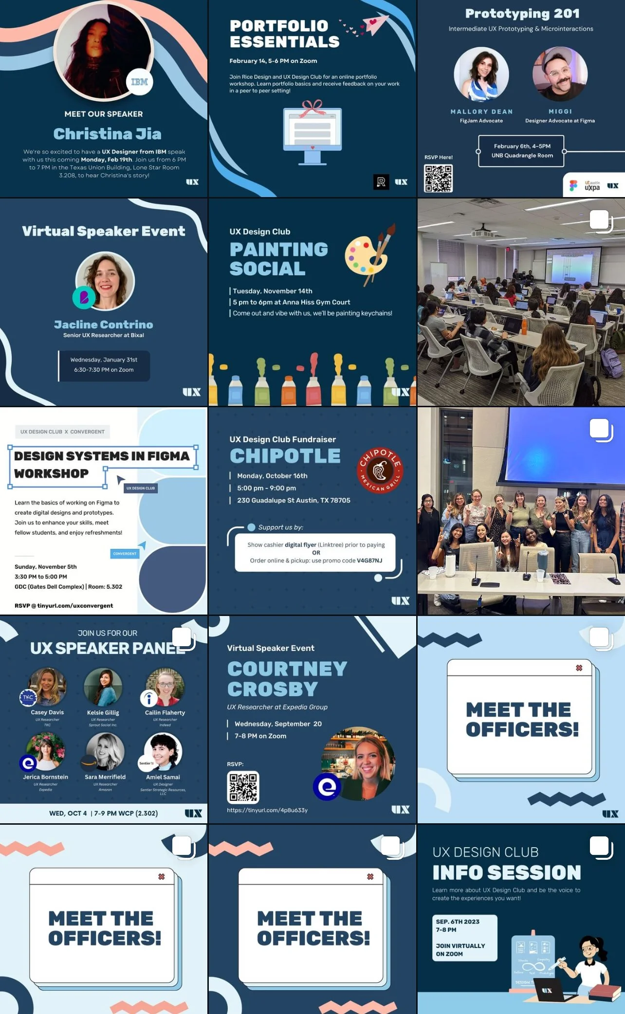 I am the Design Lead for the UX Design Club at UT Austin. When I began the position, I focused on redesigning the brand identity to increase engagement for the club. I did this by creating brand guidelines that included a new logo, highlight covers, specific typography, colors, and design templates. I manage a team of 3 designers who create the posts.