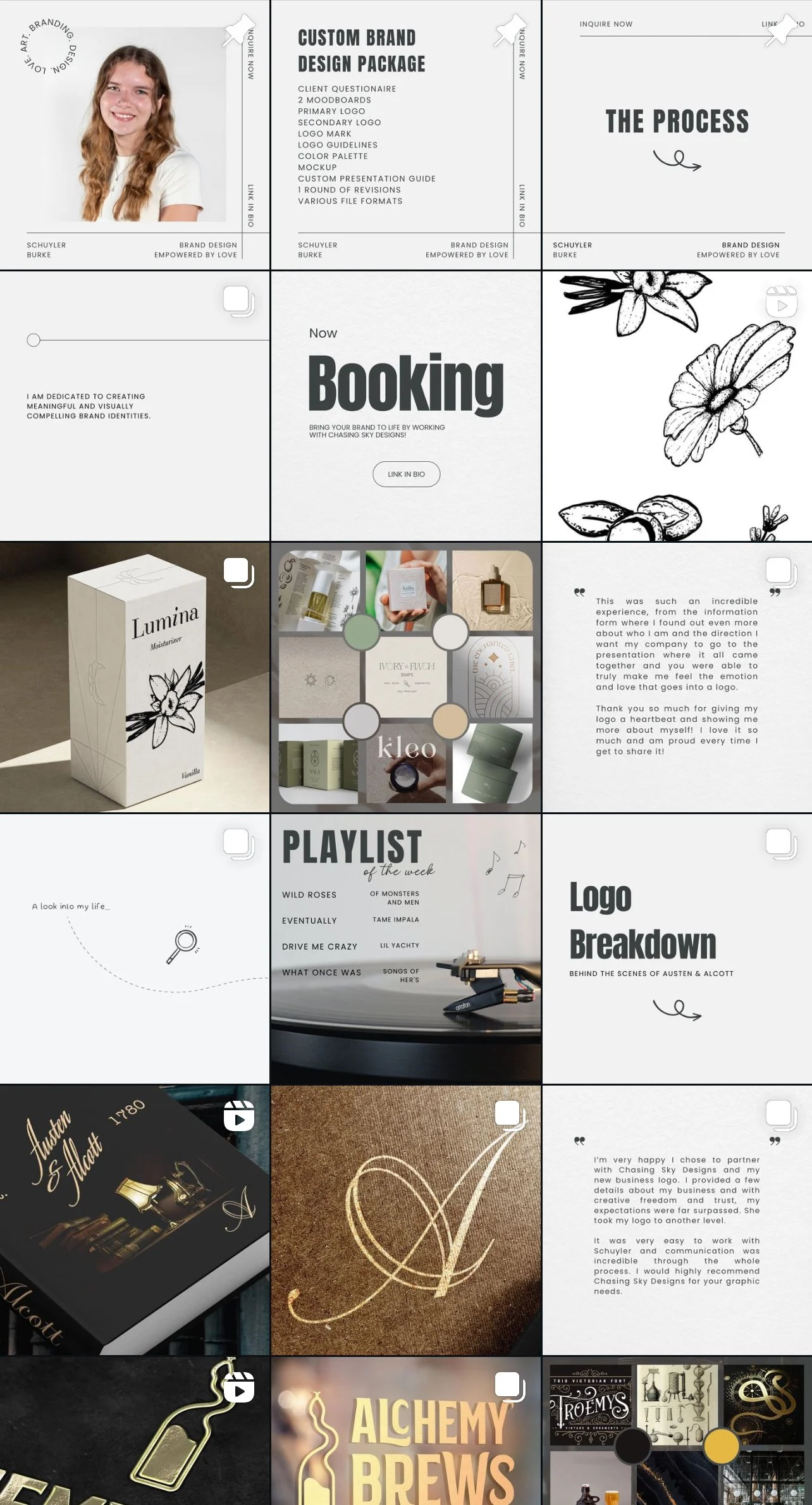 Chasing Sky Designs is my personal brand design business. I created a social media account to promote my business and share content. The content includes videos of my process, about me’s, helpful tips, and mock-ups of the designs I create.